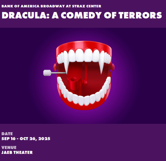 Just in time for spooky season, the Straz Center in Tampa, FL is hosting “Dracula: A Comedy of Terrors” in the intimate Jaeb Theater. This comedic interpretation of Bram Stoker’s legendary vampire novel delivers all the iconic scenes you’d expect, but with a irreverent twist and clever character reversals. Jonathan Harker (James Romney) is engaged to Lucy Westfeldt (Susana Cordon) who has a very single sister, Mina Westfeldt (Paul Vogt). The bloodthirsty Dracula (Keaton Miller) becomes utterly captivated by Lucy instead of Mina—a woman whose desires make her completely susceptible to the vampire’s nocturnal charms.