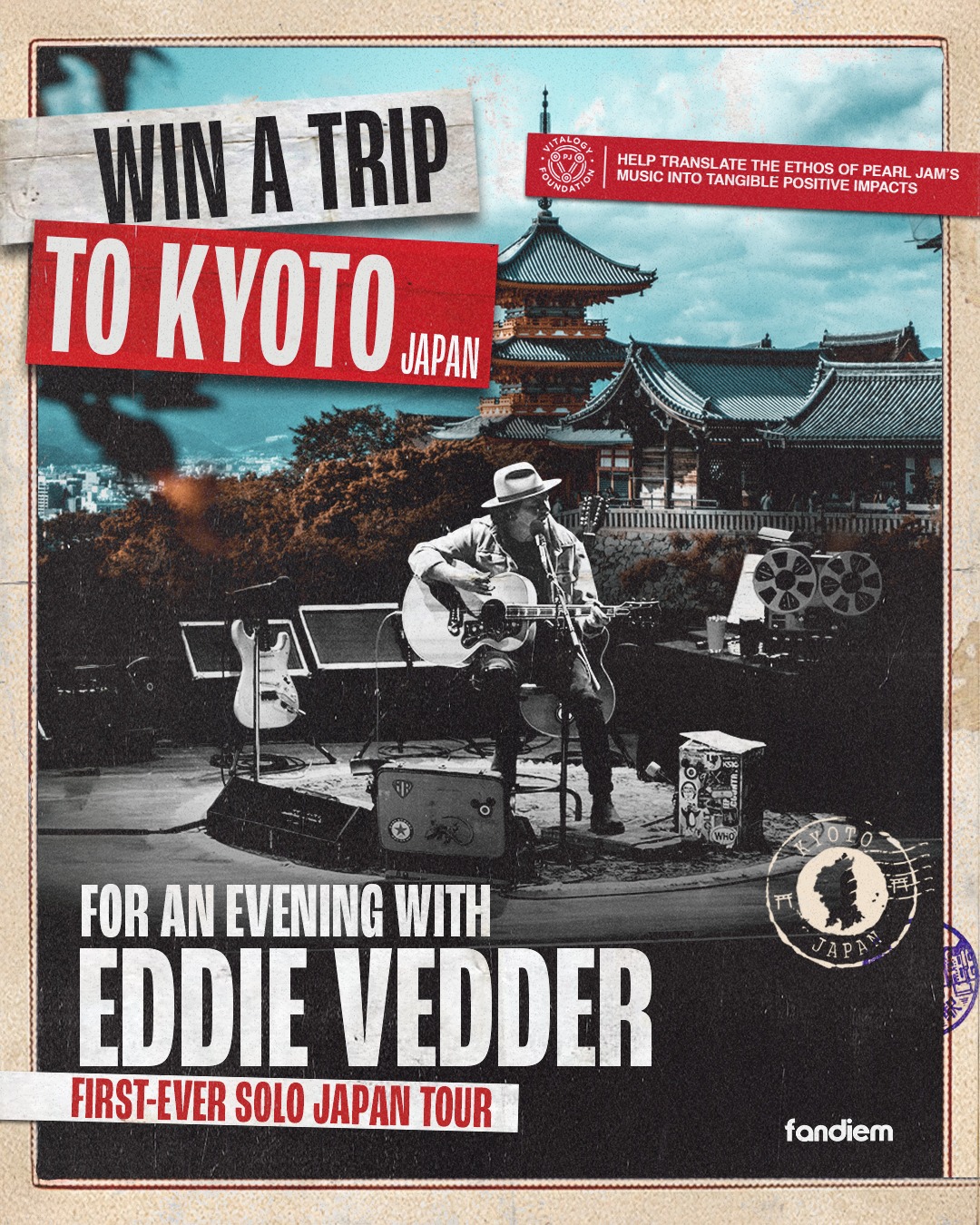 For fans that donate to Pearl Jam’s Vitalogy Foundation, they have a chance to win a VIP all expenses paid trip to see EV. The prize includes flights to Kyoto, a 3-night hotel stay, a 2-night stay at a traditional Japanese Ryokan, and two tickets for Eddie’s show at Rohm Theater on April 17. Plus, you’ll get to explore Japan with day tour of Kyoto and Nara, enjoy a Kyoto food tour, and take part in a traditional tea ceremony.